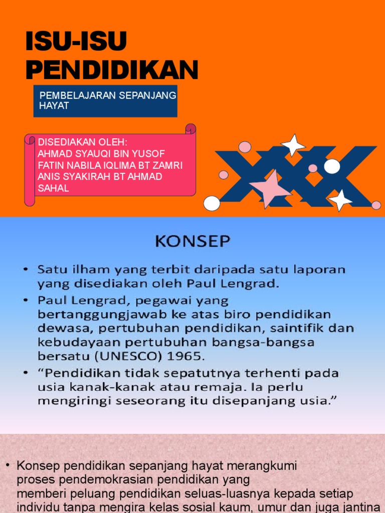 Pendidikan Sepanjang Hayat adalah sebuah konsep yang menyatakan bahwa proses pendidikan dapat dilakukan kapan saja dan dimana saja tanpa dibatasi oleh usia. Kanak-kanak Berkeperluan Khas 1 UNIT PELAJARAN 1 DEFINISI DAN KONSEP PENDIDIKAN KHAS HASIL PEMBELAJARAN Di akhir unit ini anda diharap dapat. Melalui tiga prinsip utama iaitu pendidikan menyeluruh dan bersepadupembelajaran yang mengembirakan dan bermakna dan pendidikan sepanjang hayat.